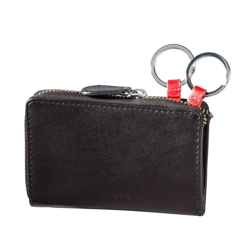 LLOYD presenta el estuche “KEYCASE” en cuero liso negro. Este estuche cuenta con dos llaveros y un compartimento con cremallera en la parte frontal. Es ideal para guardar las llaves.