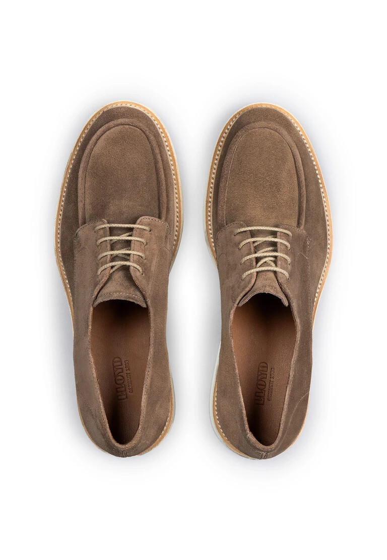 El modelo JUPITER de LLOYD combina un diseño atemporal con una comodidad funcional. Fabricado en ante de alta calidad, este zapato derby se presenta en un elegante color marrón. Ideal para el trabajo o el ocio, impresiona por su elegante sistema de cordones y su forro 100 % de piel. La suela de goma garantiza una tracción óptima y refuerza la función Extralight del zapato. Con puntera redonda, el JUPITER ofrece un ajuste moderno y cómodo para hombre. Este zapato es un verdadero punto de atracción y complementa a la perfección cualquier armario. Su elegante diseño le impresionará.