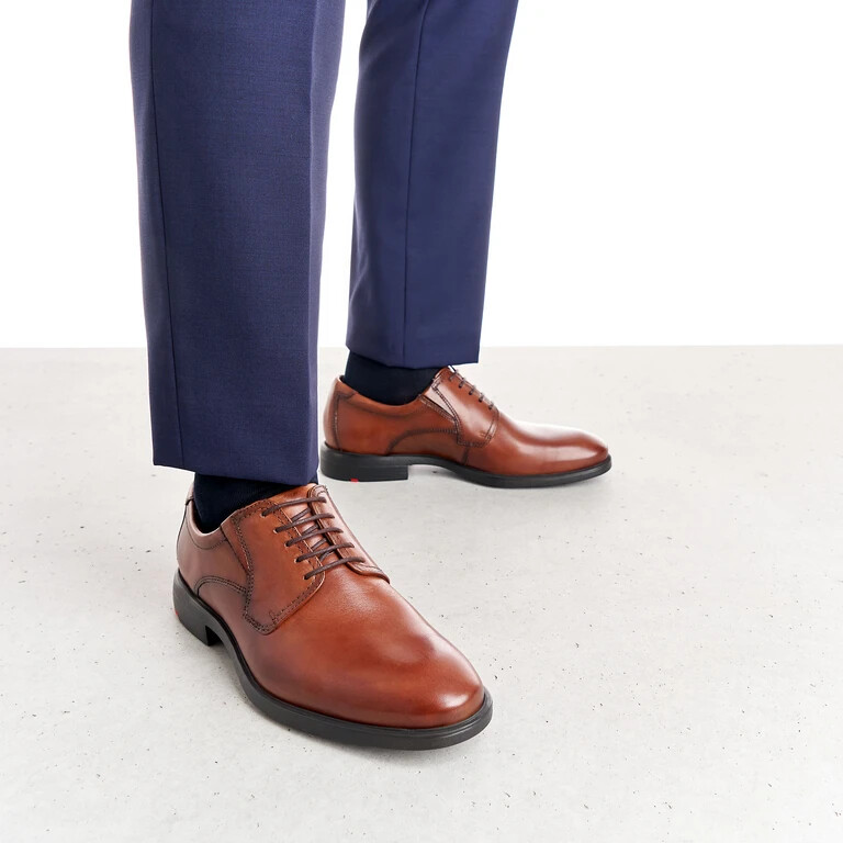 Derby clásico extra ancho con empeine liso. Este Derby con cordones ofrece una cómoda sensación de amplitud en la puntera y se adapta perfectamente a empeines altos. La piel de becerro de alta calidad luce un aspecto elegante gracias a su elaborado acabado. La inserción elástica junto a los ojales ayuda a regular el ajuste en el empeine. La suela exterior extra ligera y flexible garantiza una pisada cómoda.