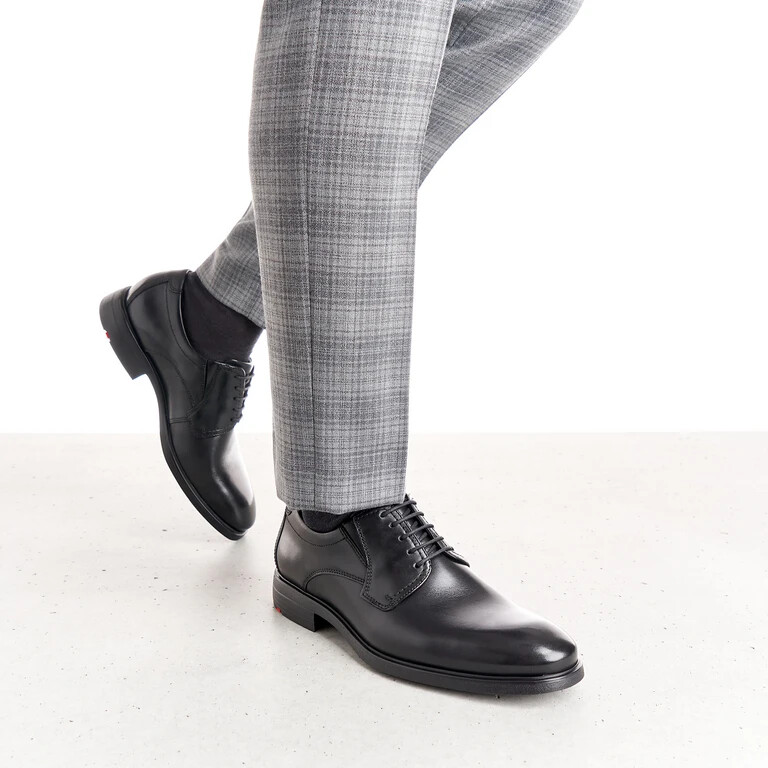Derby clásico extra ancho con empeine liso. Este Derby con cordones ofrece una cómoda sensación de amplitud en la puntera y se adapta perfectamente a empeines altos. La piel de becerro de alta calidad luce un aspecto elegante gracias a su elaborado acabado. La inserción elástica junto a los ojales ayuda a regular el ajuste en el empeine. La suela exterior extra ligera y flexible garantiza una pisada cómoda.