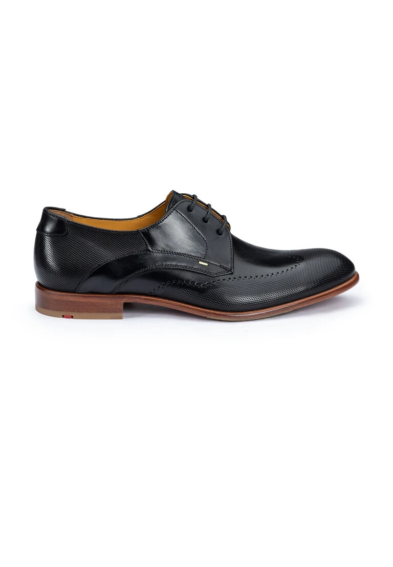 El zapato derby NASSAU de LLOYD, en un elegante color negro, está fabricado en piel lisa y repujada de alta calidad. Con su clásico sistema de cordones y su punta redonda, combina un diseño atemporal con una apariencia elegante. El forro, 100 % piel, garantiza una agradable sensación al tacto. La suela de goma completa el zapato, ideal para ocasiones festivas o para el trabajo. Este zapato es la elección perfecta para quienes valoran la combinación perfecta de estilo y comodidad. El NASSAU es una pieza clave de moda y un complemento práctico para tu colección de zapatos. Descubre un estilo atemporal que nunca pasa de moda con LLOYD.