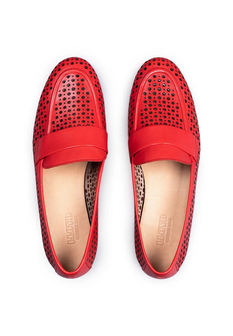 El zapato sin cordones LLOYD en rojo brillante combina una elegancia atemporal con un toque moderno. La parte superior, hecha de cuero liso de alta calidad y cuero perforado, garantiza un estilo elegante y un ajuste cómodo. El cierre sin cordones facilita su colocación y se adapta a las necesidades del día a día. Con su elegante punta redonda, este zapato sin cordones es ideal para ocasiones festivas y actividades informales de ocio. El forro 100 % cuero realza la alta calidad y durabilidad del modelo. Todos estos elementos crean un zapato moderno y versátil. El zapato sin cordones LLOYD es la opción perfecta para mujeres que valoran el estilo y la comodidad.
